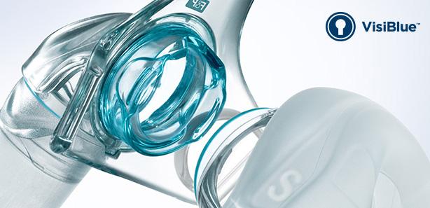 Les repères bleus intégrés aux principaux composants du masque facilitent l'utilisation, l'orientation, le démontage et le remontage du masque par le patient.