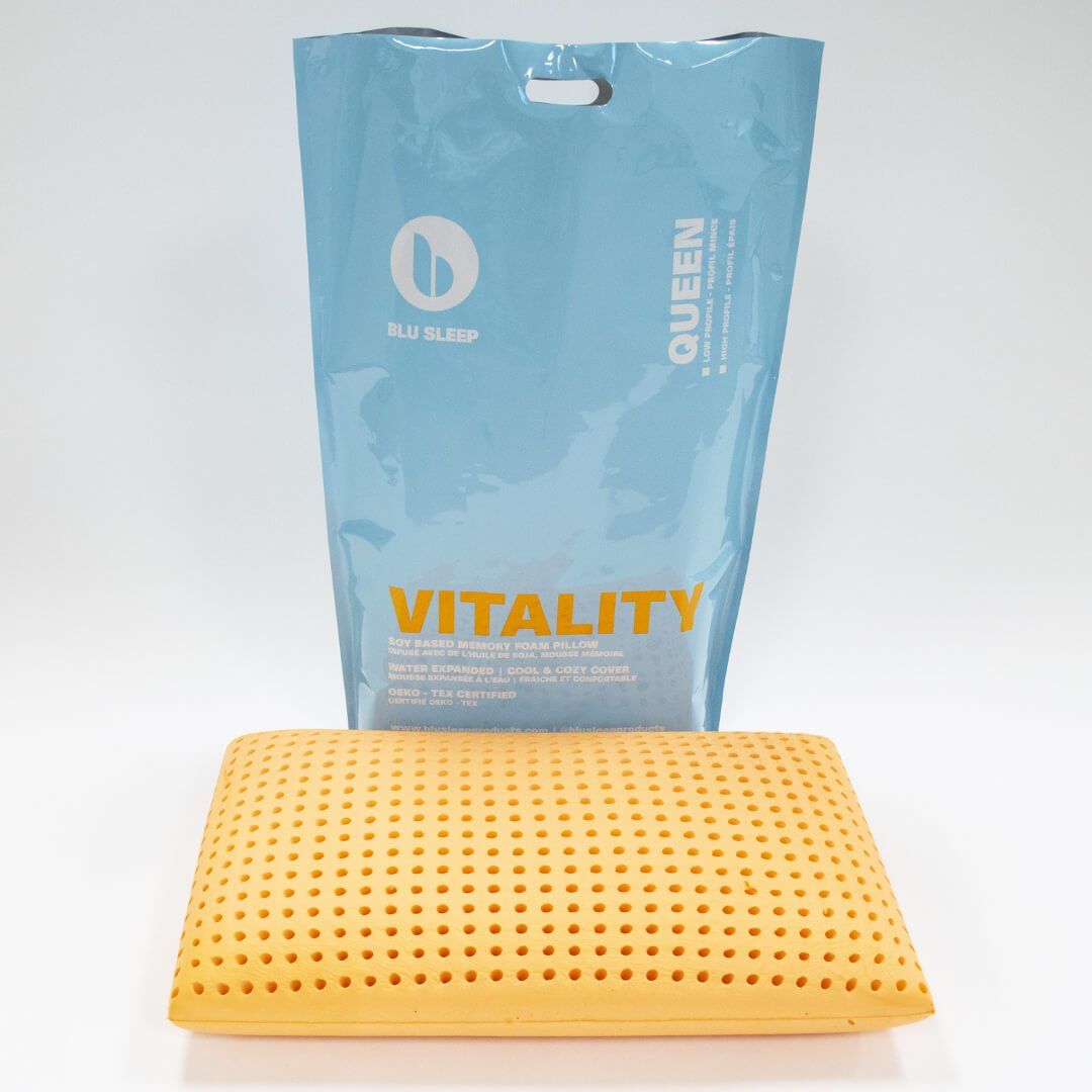 Obtenez une meilleure qualité de sommeil avec notre oreiller en mousse à mémoire Vitality. Cet oreiller est infusé de soja hydratant. La sensation de peluche de l’oreiller Vitality soutient également votre tête et votre cou et réduit les points de pression.
