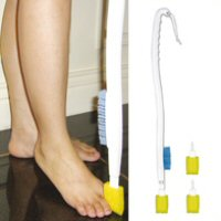 Long manche avec éponge pour nettoyer entre les orteils. Longueur totale: 60 cm. L’éponge mesure 4 x 5,5 cm; la petite brosse 7,5 cm. Trois éponges sont incluses.